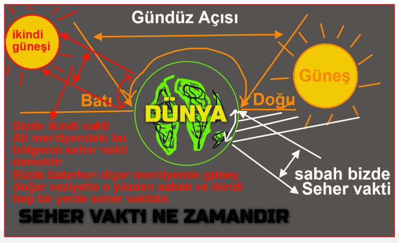 ikindi ile akşam arası okuncak ise, bizim meridyende ikindi vakti, güneş batmaya yüz tutmuşken, diğer meridyende sabah olmak üzre, ve güneş doğmak üzeredir, ve bizdeki ikindi vakti, diğer meridyenin seher vaktidir, ve bizden önceki meridyenlerin ikindi vakti de, bizim seher vaktimizdir, öyle olunca ikindi va sabah hep biryerlerde seher vaktidir.