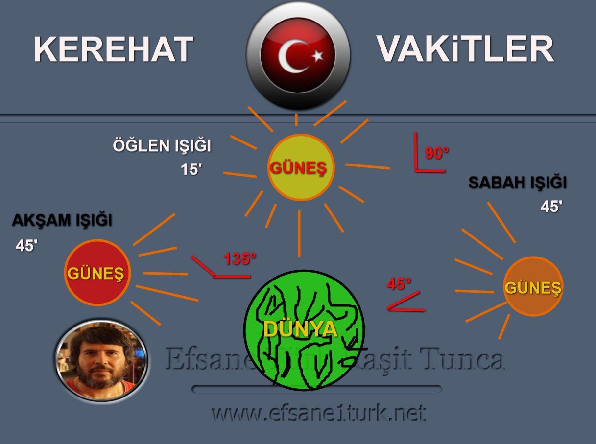 Şimdi kerahat vakitler meselesini aşağıdaki kendi çizdiğim şekiller ile anlatırsak, Sabah Güneşin ışığı dünyamıza 45° dereceden ulaşıncaya kadar olan vakit kerahat vaktidir, yani güneş ilk doğup 45° yükselinceye kadar olan ki vakit. Bunu bazı alimler 19° demişlerse de öyle değildir. Yine eski alimler, Eskiden derece ve açı nedir bilinmediği için, Güneş bir mızrak boyu yükselinceye kadar diye tarif etmişler. Bugün Fizikte, coğrafyada, bizler ışıkların açısını ve derecesini hesap edebiliyoruz. Bugün Fizik sabit kurallarla anlatılabilir. Bir Mızrak tarifi ile anlatılmaz, bugüne en güzel şekilde uygun anlatmak 45°(derece) ile demektir.