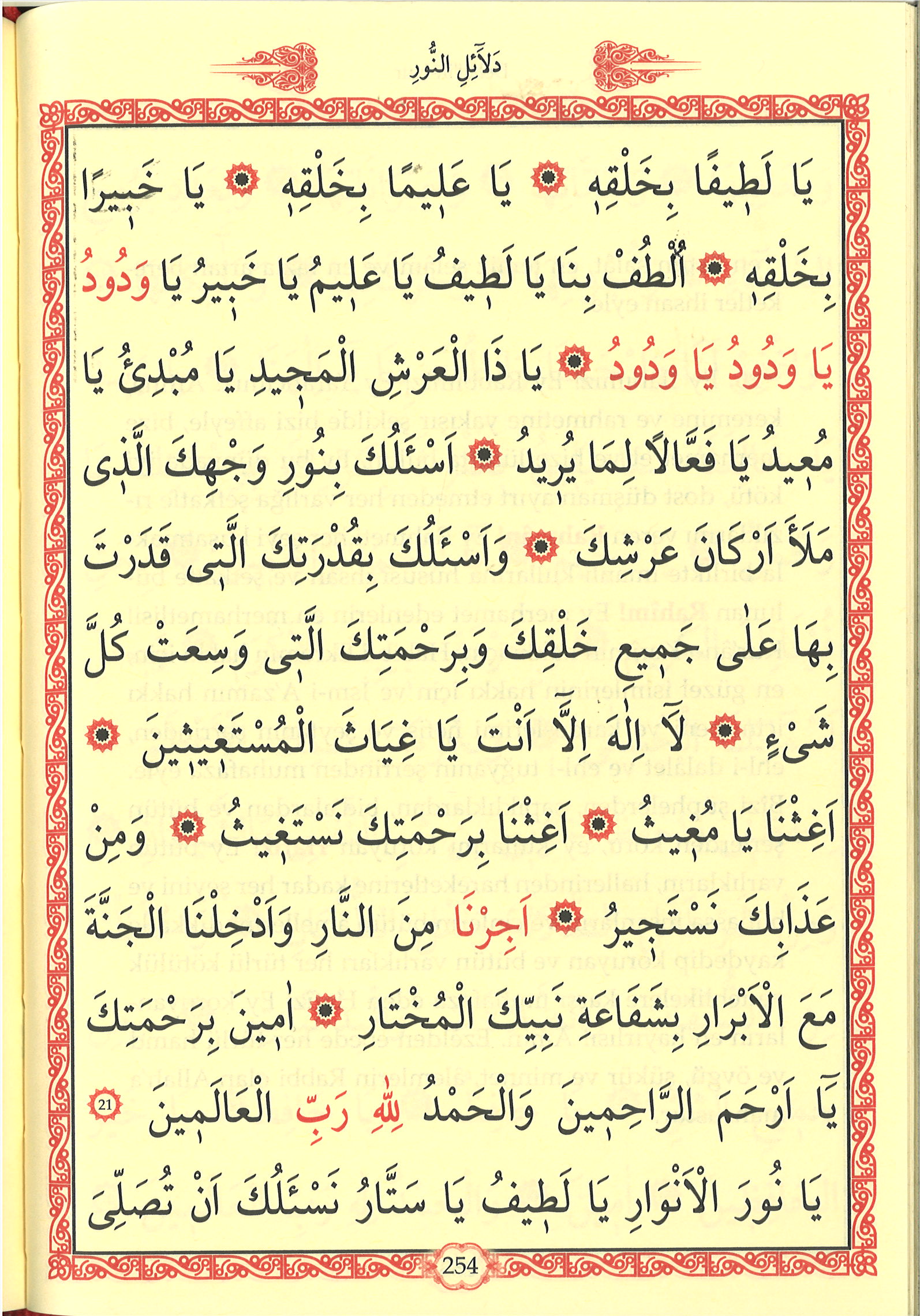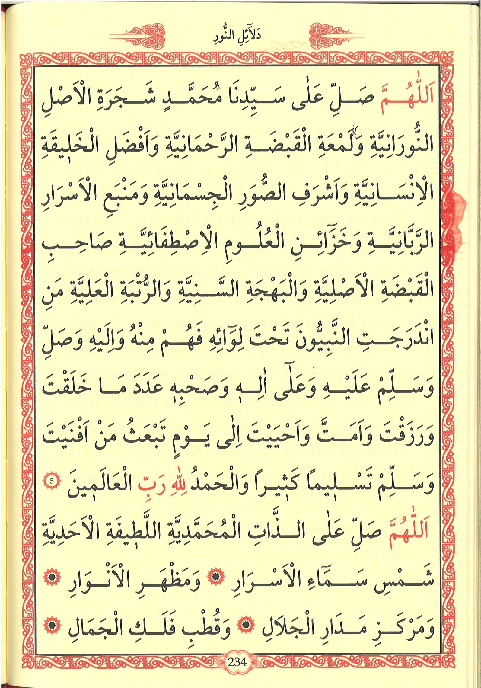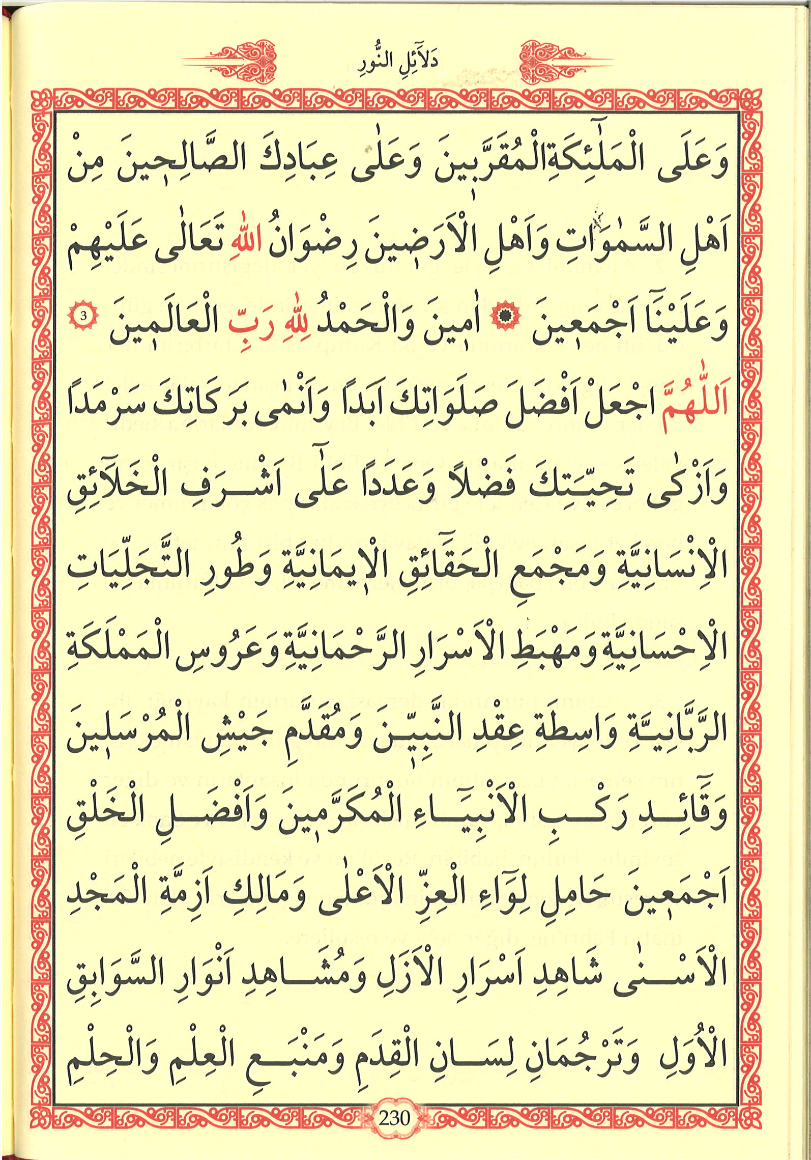 ﻳَﺎ ﻧُﻮﺭَ ﺍﻟْﺎَﻧْﻮَﺍﺭِ ﻳَﺎ ﻟَﻄِﻴﻒُ ﻳَﺎ ﺳَﺘَّﺎﺭُ ﻧَﺴْﺌَﻠُﻚَ ﺍَﻥْ ﺗُﺼَﻠِّﻰَ ﻋَﻠَﻰ ﺳَﻴِّﺪِﻧَﺎ ﻣُﺤَﻤَّﺪٍ ﻧَﺒْﺮَﺍﺱِ ﺍﻟْﺎَﻧْﺒِﻴَٓﺎﺀِ ﻭَ ﻧَﻴِّﺮِ ﺍﻟْﺎَﻭْﻟِﻴَٓﺎﺀِ ﻭَ ﺯِﺑَﺮْﻗَﺎﻥِ ﺍﻟْﺎَﺻْﻔِﻴَٓﺎﺀِ ﻭَ ﻳُﻮﺡِ ﺍﻟﺜَّﻘَﻠَﻴْﻦِ ﻭَ ﺿِﻴَٓﺎﺀِ ﺍﻟْﺨَﺎﻓِﻘَﻴْﻦِ ﻭَ ﺍَﻥْ ﺗَﺮْﻓَﻊَ ﻭُﺟُﻮﺩَﻧَٓﺎ ﺍِﻟَﻰ ﻓَﻠَﻚِ ﺍﻟْﻌِﺮْﻓَﺎﻥِ ﻭَ ﺍَﻥْ ﺗُﺜَﺒِّﺖَ ﺷُﻬُﻮﺩَﻧَﺎ ﻓِﻰ ﻣَﻘَﺎﻡِ ﺍﻟْﺎِﺣْﺴَﺎﻥِ ﺍَﻣِﻴﻦَ ﻭَ ﺍﻟْﺤَﻤْﺪُ ﻟِﻠَّﻪِ ﺭَﺏِّ ﺍﻟْﻌَﺎﻟَﻤِﻴﻦَ