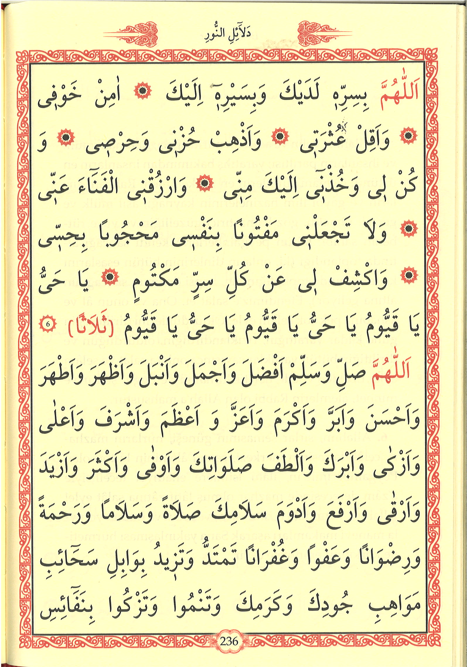 ﺍَﻟﻠَّﻬُﻢَّ ﺻَﻞِّ ﻋَﻠَﻰ ﺍﻟﺬَّﺍﺕِ ﺍﻟْﻤُﺤَﻤَّﺪِﻳَّﺔِ ﺍﻟﻠَّﻄِﻴﻔَﺔِ ﺍﻟْﺎَﺣَﺪِﻳَّﺔِ ﺷَﻤْﺲِ ﺳَﻤَٓﺎﺀِ ﺍﻟْﺎَﺳْﺮَﺍﺭِ ﻭَ ﻣَﻈْﻬَﺮِ ﺍﻟْﺎَﻧْﻮَﺍﺭِ ﻭَ ﻣَﺮْﻛَﺰِ ﻣَﺪَﺍﺭِ ﺍﻟْﺠَﻠﺎَﻝِ ﻭَ ﻗُﻄْﺐِ ﻓَﻠَﻚِ ﺍﻟْﺠَﻤَﺎﻝِ ﺍَﻟﻠَّﻬُﻢَّ ﺑِﺴِﺮِّﻩِ ﻟَﺪَﻳْﻚَ ﻭَ ﺑِﺴَﻴْﺮِﻩِٓ ﺍِﻟَﻴْﻚَ ﺍَﻣِﻦْ ﺧَﻮْﻓِﻰ ﻭَ ﺍَﻗِﻞْ ﻋُﺜْﺮَﺗِﻰ ﻭَ ﺍَﺫْﻫِﺐْ ﺣُﺰْﻧِﻰ ﻭَ ﺣِﺮْﺻِﻰ ﻭَ ﻛُﻦْ ﻟِﻰ ﻭَ ﺧُﺬْﻧِٓﻰ ﺍِﻟَﻴْﻚَ ﻣِﻨِّﻰ ﻭَ ﺍﺭْﺯُﻗْﻨِﻰ ﺍﻟْﻔَﻨَٓﺎﺀَ ﻋَﻨِّﻰ ﻭَ ﻟﺎَ ﺗَﺠْﻌَﻠْﻨِﻰ ﻣَﻔْﺘُﻮﻧًﺎ ﺑِﻨَﻔْﺴِﻰ ﻣَﺤْﺠُﻮﺑًﺎ ﺑِﺤِﺴِّﻰ ﻭَ ﺍﻛْﺸِﻒْ ﻟِﻰ ﻋَﻦْ ﻛُﻞِّ ﺳِﺮٍّ ﻣَﻜْﺘُﻮﻡٍ ﻳَﺎ ﺣَﻰُّ ﻳَﺎ ﻗَﻴُّﻮﻡُ ﻳَﺎ ﺣَﻰُّ ﻳَﺎ ﻗَﻴُّﻮﻡُ ﻳَﺎ ﺣَﻰُّ ﻳَﺎ ﻗَﻴُّﻮﻡُ ﴿٣﴾