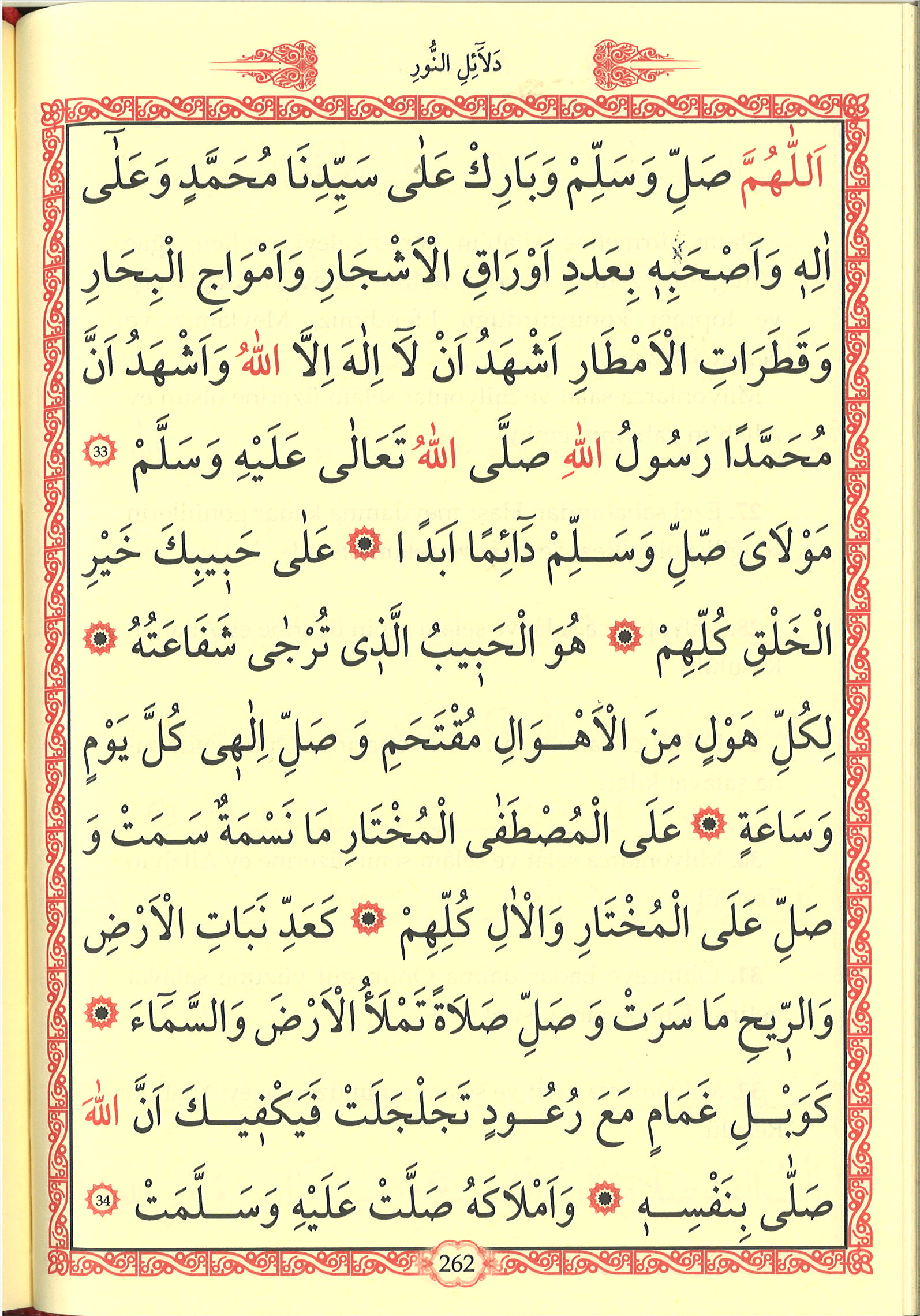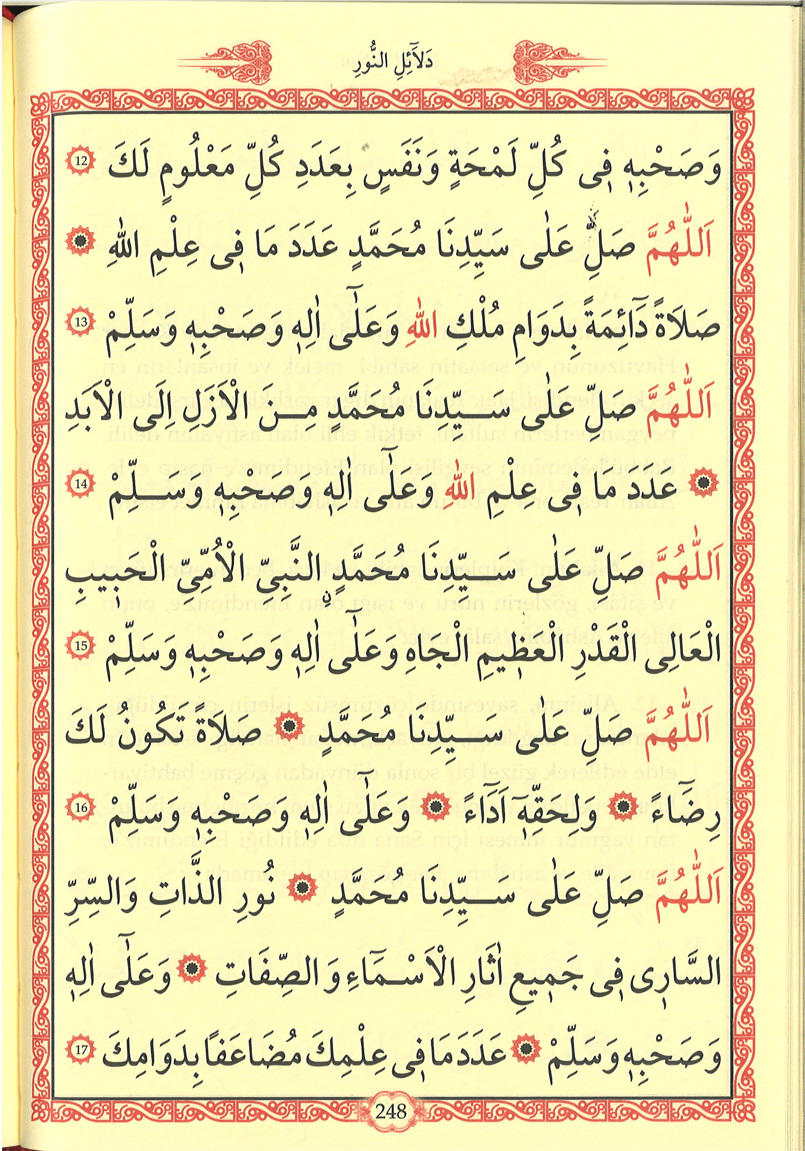ﺍَﻟﻠَّﻬُﻢَّ ﺻَﻞِّ ﻋَﻠَﻰ ﺳَﻴِّﺪِﻧَﺎ ﻣُﺤَﻤَّﺪٍ ﺍﻟﺴَّﺎﺑِﻖِ ﺍِﻟَﻰ ﺍﻟْﺎَﻧَﺎﻡِ ﻧُﻮﺭُﻩُ ﻭَ ﺭَﺣْﻤَﺔٌ ﻟِﻠْﻌَﺎﻟَﻤِﻴﻦَ ﻇُﻬُﻮﺭُﻩُ ﻋَﺪَﺩَ ﻣَﻦْ ﻣَﻀَﻰ ﻣِﻦَ ﺍﻟْﺒَﺮِﻳَّﺔِ ﻭَ ﻣَﻦْ ﺑَﻘِﻰَ ﻭَ ﻣَﻦْ ﺳَﻌِﺪَ ﻣِﻨْﻬُﻢْ ﻭَ ﻣَﻦْ ﺷَﻘِﻰَ ﺻَﻠﺎَﺓً ﺗَﺴْﺘَﻐْﺮِﻕُ ﺍﻟْﻌَﺪَّ ﻭَ ﺗُﺤِﻴﻂُ ﺑِﺎﻟْﺤَﺪِّ ﺻَﻠﺎَﺓً ﻟﺎَ ﻏَﺎﻳَﺔَ ﻟَﻬَﺎ ﻭَ ﻟﺎَ ﺍﻧْﺘِﻬَٓﺎﺀَ ﻭَ ﻟﺎَٓ ﺍَﻣَﺪَ ﻟَﻬَﺎ ﻭَ ﻟﺎَ ﺍﻧْﻘِﻀَٓﺎﺀَ ﺻَﻠﺎَﺗَﻚَ ﺍﻟَّﺘِﻰ ﺻَﻠَّﻴْﺖَ ﻋَﻠَﻴْﻪِ ﺻَﻠﺎَﺓً ﺩَٓﺍﺋِﻤَﺔً ﺑِﺪَﻭَﺍﻣِﻚَ ﻭَ ﻋَﻠَٓﻰ ﺍَﻟِﻪِ ﻭَ ﺻَﺤْﺒِﻪِ ﻣِﺜْﻞَ ﺫَﻟِﻚَ ﺑِﺮَﺣْﻤَﺘِﻚَ ﻳَٓﺎ ﺍَﺭْﺣَﻢَ ﺍﻟﺮَّﺍﺣِﻤِﻴﻦَ