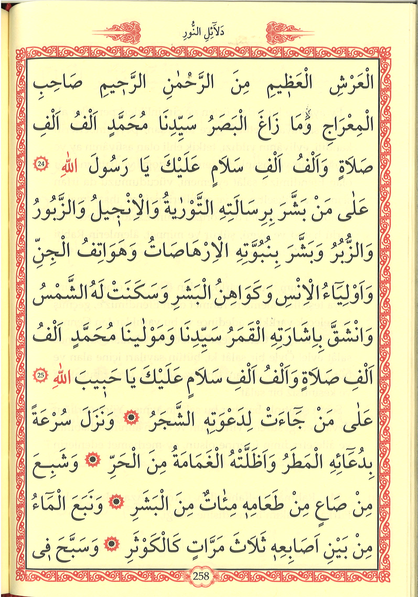 ﻋَﻠَﻰ ﻣَﻦْ ﺑَﺸَّﺮَ ﺑِﺮِﺳَﺎﻟَﺘِﻪِ ﺍﻟﺘَّﻮْﺭَﻳﺔُ ﻭَ ﺍﻟْﺎِﻧْﺠِﻴﻞُ ﻭَ ﺍﻟﺰَّﺑُﻮﺭُ ﻭَ ﺍﻟﺰُّﺑُﺮُ ﻭَ ﺑَﺸَّﺮَ ﺑِﻨُﺒُﻮَّﺗِﻪِ ﺍﻟْﺎِﺭْﻫَﺎﺻَﺎﺕُ ﻭَ ﻫَﻮَﺍﺗِﻒُ ﺍﻟْﺠِﻦِّ ﻭَ ﺍَﻭْﻟِﻴَٓﺎﺀُ ﺍﻟْﺎِﻧْﺲِ ﻭَ ﻛَﻮَﺍﻫِﻦُ ﺍﻟْﺒَﺸَﺮِ ﻭَ ﺳَﻜَﻨَﺖْ ﻟَﻪُ ﺍﻟﺸَّﻤْﺲُ ﻭَ ﺍﻧْﺸَﻖَّ ﺑِﺎِﺷَﺎﺭَﺗِﻪِ ﺍﻟْﻘَﻤَﺮُ ﺳَﻴِّﺪِﻧَﺎ ﻭَ ﻣَﻮْﻟَﻴﻨَﺎ ﻣُﺤَﻤَّﺪٍ ﺍَﻟْﻒُ ﺍَﻟْﻒِ ﺻَﻠﺎَﺓٍ ﻭَ ﺍَﻟْﻒُ ﺍَﻟْﻒِ ﺳَﻠﺎَﻡٍ ﻋَﻠَﻴْﻚَ ﻳَﺎ ﺣَﺒِﻴﺐَ ﺍﻟﻠَّﻪِ