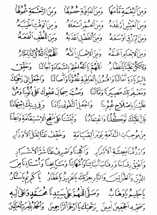Allâhümme yâ Mâlik-er-Rigâb.. Yâ müfettih-el-ebvâb.. Ve yâ müsebbib-el-esbâb heyyi lenâ sebeben lâ nestatıy’u lehu taleben.. Allâhümmec’alnâ meşguliyne bi-emrike âminiyne bi-ahdike âyisiyne min halkıke ânisiyne bike müstevhışıyne an gayrike radıyne bi-kada’ike sâbiriyne alâ belâ’ike şâkiriyne le-ni’mâ’ike mütelezziziyne bi-zikrike ferihiyne bi-kitabike münâciyne bike fi ânâ’il-leyli ve etraf-in-nehâr mübgızıyne lid-dünya muhibbiyne lil-âhireti müştakıyne ilâ lika’ike müteveccihiyne ilâ cenâbike müsta’ıddıyne lil-mevti..Rabbenâ Âtina mâ ve adtenâ alâ rüsûlike ve lâ tuhzinâ yevm-el-kıyameti inneke lâ tuhlif-ül-mi’ad. Allâhümmec’al tevfiyke refiykanâ ves-sırat-el müstakiyme tariykanâ. Allâhümme evsılnâ ilâ makasidina ve tüb aleynâ inneke ent-et-tevvab-ür-rahiym.. Allâhümme bike asbahnâ ve bike emseynâ ve bike nahyâ ve bike nemûtü ve ileyk-el-masiyr.. Allâhümme erinel-hakka hakkan verzuknâ ettiba’ahu ve erinel-bâtıla bâtılen verzuknâ ectinâbehu teveffenâ müslimiyne velhıknâ bis-sâlihiyn.. Vedfâ’annâ şerrez-zâlimiyne ve eşriknâ fi dua-il-mü’miniyn.. Ve ginâ Rabbenâ şerre mâ kadayte.. Allâhümmağfir li-ümmeti Muhammed.. Allâhümmansur ümmete Muhammed.. Allâhümmerham ümmete Muhammed.. Allâhümmahfaz ümmete Muhammed.. Allâhümme ferric an ümmeti Muhammed.. Allâhümme yâ habib-et-tevvâbiyne tüb aleynâ ve yâ emân-el-hâ’ifiyne âminnâ ve yâ delil-el-mütehayyiriyne düllenâ ve yâ hadiyel-mudıllıynehdinâ ve yâ gıyas-el müstagıysiyne agisnâ ve yâ recâ-el-münkatı’ıyne lâ taktâ’ recâ’enâ ve yâ gafir-el-müznibiyne ıgfir lenâ zünübenâ ve kefir annâ seyyi’atinâ ve teveffenâ mâ’al-ebrâr Allâhümme nevvir kulûbenâ.. Allâhümmeşrah sudurenâ.. Allâhümme yessir umurenâ.. Allâhümmestür uyubenâ.. Yâ hafiy-yel-eltâfi neccinâ mimmâ nehaf.. Allâhümmagfir lenâ ve valideynâ ve li-üstâzinâ ve li-meşâyihinâ ve li-ihvanina ve li-ashabinâ ve li-ahbabinâ ve li-aşâ’irinâ ve li-kabâ’ilinâ ve limen lehu hakka aleynâ ve limen vessanâ bid-dua’il-hayri ve li-cemi-il mü’miniyne vel-mü’minât vel-müslimiyne vel-müslimât el-ahyâ’ü minhüm vel-emvât.. Allâhüm