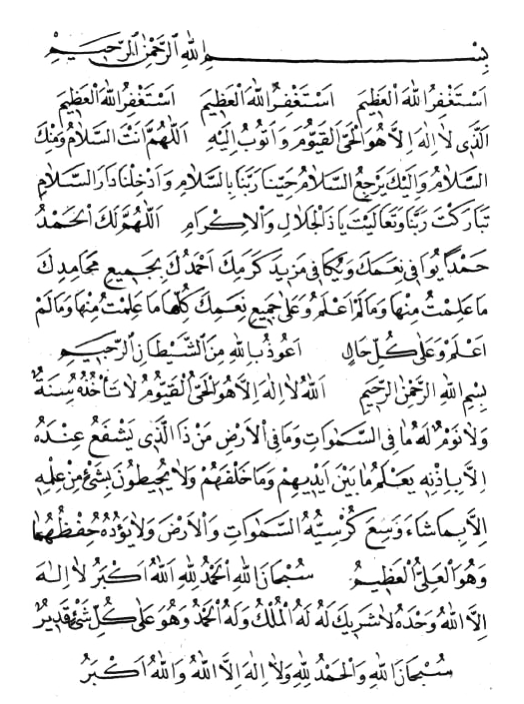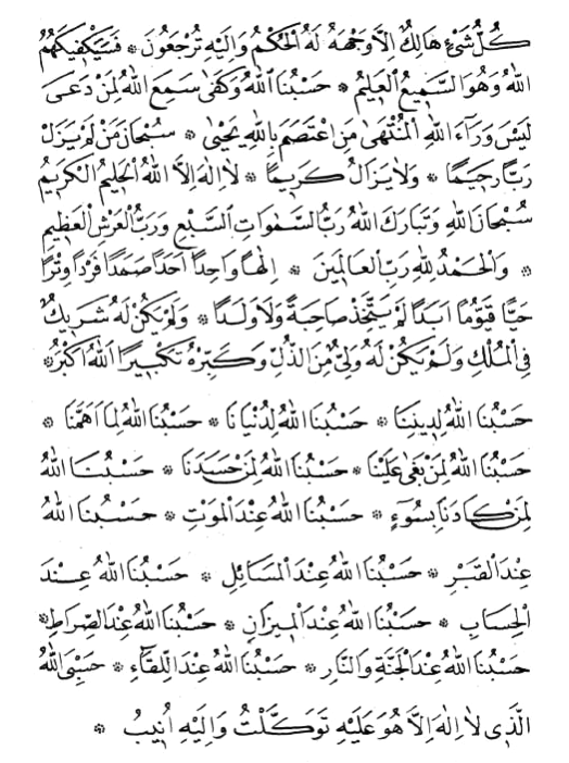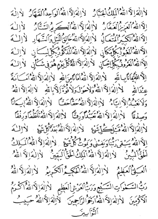 Allâhü lâ ilâhe illâ hüvel-Hayyül Gayyûmü lâ te’hüzühû sinetüv velâ nevm lehû mâ fis-semâvâti ve mâ fil-ardi men-zellezî yeşfeu indehû illâ bi-iznih yâ’lemü mâ beyne eydiyhim ve mâ halfehüm ve lâ yuhiytûne bi-şey’in min ilmihiy illâ bi-mâ şâ’e vesia kürsiy-yühüs-semâvâti vel-arda ve lâ yeûdühû hifzuhümâ ve hüvel-Aliyyül-Aziym.. Sübhânallâhi el-hamdü lillâhi Allâhü ekberu lâ ilâhe illallâhü vahdehû lâ şeriyke leh lehül-mülkü ve lehül-hamdü ve hüve alâ külli şey’in Gadiyr.. Sübhânallâhi vel-hamdü lillâhi ve lâ ilâhe illallâhü vallâhü ekber.. Lâ ilâhe illallâh-ül Melik-ül Cebbâr.. Lâ ilâhe illallâh-ül Vâhid-ül Gahhâr.. Lâ ilâhe illallâh-ül Aziyz-ül-Ğaffâr.. Lâ ilâhe illallâh-ül Keriym-üs-Settâr.. Lâ ilâhe illallâh-ül Kebiyr-ül-Müteâl.. Lâ ilâhe illallâhü Hâlig-ul- leyli ven-nehâr.. Lâ ilâhe illallâh-ül mâ'bûdü bi-külli mekân.. Lâ ilâhe illallâh-ül mezkûr-ül bi-külli lisân.. Lâ ilâhe illallâh-ül mâ’rûfü bi-külli ihsân.. Lâ ilâhe illallâhü iymânem billâh.. Lâ ilâhe illallâhü emânem minallâh.. Lâ ilâhe illallâhü emâneten indallâh.. Lâ ilâhe illallâhü ve lâ havle ve lâ guvvete illâ billâh.. Lâ ilâhe illallâhü ve lâ nâ’büdü illâ iyyâh.. Lâ ilahe illallâhü haggan hagga.. Lâ ilahe illallâhü iymânev ve sidgâ.. Lâ ilâhe illallâhü teabbüdev ve riggâ.. Lâ ilâhe illallâhü telâttüfev ve rifgâ.. Lâ ilâhe illallâhü gable külli şey.. Lâ ilâhe illallâhü bâ’de külli şey.. Lâ ilâhe illallâhü yebgâ Rabbünâ ve yefnâ ve yemûtü külli şey.. Lâ ilâhe illallâh-ül Melik-ül Haggul-mübiyn.. Lâ ilâhe illallâh-ül Melik-ül Haggul-yagiyn.. Lâ ilâhe illallâh-ül Aliyyül-Aziym.. Lâ ilâhe illallâh-ül Hakim-ül-Keriym.. Lâ ilâhe illallâhü Rabbüs semâvât-is-seb’i ve Rabbül arş-il-Aziym.. Lâ ilâhe illallâhü ekram-ül ekramiyn.. Lâ ilâhe illallâhü erham-ür-râhimiyn.. Lâ ilâhe illallâhü habib-üt-tevvâbiyn.. Lâ ilâhe illallâhü râhim-ül-mesâkiyn.. Lâ ilâhe illallâhü hâdiyül-mudilliyn.. Lâ ilâhe illallâhü delil-ül-hâiriyn.. Lâ ilâhe illallâhü emân-ül-hâifiyn.. Lâ ilâhe illallâhü ğıyâs-ül müsteğıysiyn.. Lâ ilâhe illallâhü hayr-un-nâsiriyn.. Lâ ilâhe illallâhü hayr-ul-hâfiziyn.. Lâ ilâhe illallâhü hayr-ül-vârisiyn.. Lâ ilâhe illallâhü hayr-ul-hâkimiyn.. Lâ ilâhe illallâhü hayr-ur-râzigiyn.. Lâ ilâhe illallâhü hayr-ul-fâtihiyn.. Lâ ilâhe illallâhü hayr-ul-ğâfiriyn.. Lâ ilâhe illallâhü hayr-ur-râhimiyn.. Lâ ilâhe illallâhü vahdehû ve sadega va’dehû ve nasara abdehû ve e’azze cündehû ve hezem-el-ahzâbe vahdehû ve lâ şey’e bâ’dehû.. Lâ ilâhe illallâhü ehl-ün-ni’meti ve lehül-fadlü ve lehüs-senâ’ül-hasen.. Lâ ilâhe illallâhü adede halgihi ve zinete arşihi ve ridâe nefsihi ve midâde kelimâtihi.. Lâ ilâhe illallâhü Sahib-ül vahdâniyyet-il ferdâniyyet-il gadiymiyyet-il ezeliyyet-il ebediyyet-illeziy leyse lehû siddüv ve lâ niddüv ve lâ şibhüv ve lâ şeriyküy yuhyi ve yümiytü ve hüve hayyül lâ yemûtü biyedih-il hayru ve hüve alâ külli şey’in gadiyr ve ileyh-il masiyr.. Hüvel-evvelü vel-Âhiru vez-Zâhiru vel-Bâtınü ve hüve bi-külli şey’in Aliym. Leyse kemislihi şey’ün ve hüves-semi’ül-Basiyr.. Hasbünallâhü ve ni’mel-vekiyl ni’mel Mevlâ ve ni’men-nasiyr.. Hasbünallâhü ve ni’mel-vekiyl ni’mel-Mevlâ ve ni’men-nasiyr.Ğufrâneke Rabbenâ ve ileyk-el-masiyr. Allâhümme lâ mânia limâ a’tayte ve lâ mu’tiye limâ mena’te ve lâ râdde limâ gadayte ve lâ yenfeu zel-ceddi mink-el-ced.. Sübhâne Rabbiyel aliyyil-â’lel-Vehhâb.. Sübhâne Rabbiyel aliyyil-a’lel Keriym-il-Vehhâb.. Sübhâneke mâ abednâke hagga ibâdetike.. Sübhâneke mâ arafnâke hagga ma’firatike.. Sübhâneke mâ zekernâke hagga zikrike.. Sübhâneke mâ şekernâke hagga şükrike.. Sübhân’Allâh-il-ebediyyil-ebed.. Sübhân’Allâh-il-Vâhid-il-Ehad.. Sübhân’Allâh-il ferd-is-Samed.. Sübhân’Allâhi Râfi-is-semâvati bi-ğayri amed.. Sübhân’Allâhi Bâsit-il-eradıyne bilâ sened.. Sübhân’Allâh-illeziy lem yettehiz sâhibetev ve lâ veledâ.. Sübhân’Allâh-illeziy lem yelid ve lem yûled ve lem yeküllehû küfüven ehad.. Sübhân-el-Melik-il-Guddûs.. Sübhâne zil-mülki vel-melekût.. Sübhâne zil-izzeti vel-azameti vel-gudrati vel-heybeti vel-celâli vel-cemâli vel-kemâli vel-begâi ves-senâi ved-diyâi vel-âlâi ven-nüamâi vel-kibriyâi vel ceberût.. Sübhân-el Melik-il-ma’bûd.. Sübhân-el Melik-il-vücûd.. Sübhân-el Melikil Hâlig-il Hayyilleziy lâ yenâmü ve lâ yemût.. Sübbûhün Guddûsür Rabbünâ ve Rabbül-melâ’iketi ver-rûh.. Sübhânallâhi vel-hamdü lillâhi ve lâ ilâhe illallâhü vallâhu ekber ve lâ havle ve lâ guvvete illâ billâh-il Aliyyil-Aziym..