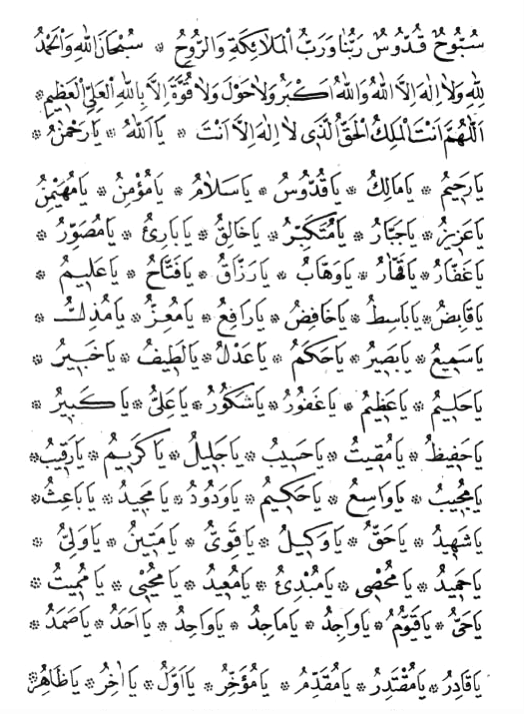 Yâ Allâhü.. Yâ Rahmânü.. Yâ Rahiymü.. Yâ Mâlikü, Yâ Guddûsü, Yâ Selâmü, Yâ Mü’minü, Yâ Müheyminü, Yâ Aziyzü, Yâ Cebbâru, Yâ Mütekebbiru, Yâ Hâligu, Yâ Bâriü, Yâ Musavviru, Yâ Ğaffâru, Yâ Gahhâru, Yâ Vehhâbü, Yâ Razzâgu, Yâ Fettâhu, Yâ Aliymü, Yâ Gâbidu, Yâ Bâsitu, Yâ Hâfidu, Yâ Râfiu, Yâ Mü’izzü, Yâ Müzillü, Yâ Semiy’u, Yâ Basiyru, Yâ Hakemü, Yâ Adlü, Yâ Latiyfü, Yâ Habiyru, Yâ Haliymü, Yâ Aziymü, Yâ Ğafûru, Yâ Şekûru, Yâ Aliyyü, Yâ Kebiyrü, Yâ Hafiyzü, Yâ Mugiytü, Yâ Hasiybü, Yâ Celiylü, Yâ Keriymü, Yâ Ragiybü, Yâ Müciybü, Yâ Vâsiu, Yâ Hagiymü, Yâ Vedûdü, Yâ Meciydü, Yâ Bâ’isü, Yâ Şehiydü, Yâ Haggu, Yâ Vekiylü, Yâ Gaviyyü, Yâ Metiynü, Yâ Veliyyü, Yâ Hamiydü, Yâ Mühsiy, Yâ Mübdiü, Yâ Müiydü, Yâ Muhyi, Yâ Mümiytü, Yâ Hayyü, Yâ Gayyûmü, Yâ Vâcidü, Yâ Mâcidü, Yâ Vâhidü, Yâ Ehadü, Yâ Samedü, Yâ Gâdiru, Yâ Mugtediru, Yâ Mugaddimü, Yâ Müahhiru Yâ Evvelü, Yâ Âhiru, Yâ Zâhiru, Yâ Bâtinü, Yâ Vâliy, Yâ Müteâliy, Yâ Berru, Yâ Tevvâbü, Yâ Mün’imü, Yâ Müntegimü, Yâ Afüvvü, Yâ Raüfü, Yâ Mâlik-el-mülki, Yâ Zel-Celâli vel-ikrâmi, Yâ Rabbi, Yâ Mugsitu, Yâ Câmiu, Yâ Ğaniyyü, Yâ Muğni, Yâ Mü’tiy, Yâ Mâniu, Yâ Darru, Yâ Nâfiu, Yâ Nûru, Yâ Hâdiy, Yâ Bediy’u, Yâ Bâgiy, Yâ Vârisü, Yâ Raşiydü, Yâ Sabûru, Yâ Sâdigu, Yâ Settâru, Yâ men tegaddeset an-il-eşbâhi zâtühû ve tenezzehet am müşabehet-il emsâli sıfâtühû ve yâ men dellet alâ vahdaniyyetihi ve âyâtihi ve şehidet bi-rübûbiyetihi masnû’atühû. Vâhidül lâ min gilletiv ve mevcûdül lâ min illetin.. Yâ men hüve bil-birri mâ’rûfüv ve bil ihsâni mevsûfün. Ma’rûfüm bilâ ğayetin, ve mevsûfüm bilâ nihayetin evvelün gadiymüm bilâ ibtidâ’i, âhirün keriymür rahiymüm bilâ intihâ’i.. Ve ğafera zünûb-el müznibiyne keramev ve hilmen.. Yâ mel leyse kemislihi şey’ün ve hüves-Semiy’ul-Basiyr.. Hasbünallâhü ve ni’mel-vekil ve ni’mel-Mevlâ ve ni’men nasiyr.. Yâ dâ’imem bilâ fenâ’iv ve yâ gâimem bilâ zevâlin ve yâ müdebbiram bilâ veziyrün, sehhil aleynâ ve alâ vâlidiynâ külle asiyr. Lâ uhsiy senâ’en aleyke ente kemâ esneyte alâ nefsike azze câruke ve celle senâ’üke ve tegaddeset esmâ’üke ve azume şânüke ve lâ ilâhe ğayruke.. Yef’alüllahe mâ yeşâ’ü bi-gudratihi ve yahkümü mâ yüriydü ve bi-izzetihi.. Elâ ilâllâhi tasiyr-ül-umûr küllü şey’in hâlikün illâ vechehû lehül-hükmü ve ileyhi türce’ûn.. Feseyekfiykehümüllahü ve hüves-Semiy’ul-Aliym.. Hasbünallâhü ve kefâ semiAllâhü limen deâ leyse verâAllâhil müntehâ menî tesame billâhi yuhyiy.. Sübhâne men lem yezel Rabben rahiymev ve lâ yezâlü keriymen.. Lâ ilâhe illallâhül haliym-ül-keriymü Sübhânallâhi ve tebârakallâhü Rabbüs-semâvatis-seb’i ve Rabbül arş-il-Aziym vel-hamdü lillâhi Rabbil-âlemiyne ilâhev vâhiden ehaden sameden ferden vitren hayyen gayyûmen ebeden lem yettehiz sahibetev ve lâ veledev ve lem yekül lehû şeriykün fil mülki ve lem yekûl lehû veliyyüm min-ez-zülli ve kebbirhü tekbiyran Allâhü ekber..