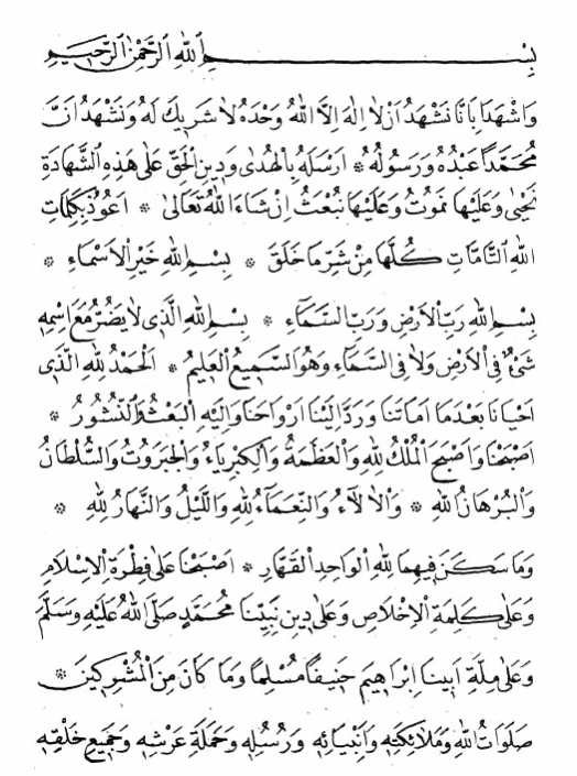 Hasbünallâhü li-dininâ.. Hasbünallâhü li-dünyanâ.. Hasbünallâhü limâ ehemmenâ.. Hasbünallâhü limen bega aleynâ.. Hasbünallâhü limen hasedenâ, Hasbünallâhü limen kâdena bi-su’in.. Hasbünallâhü ind-el-mevti.. Hasbünallâhü ind-el-kabri.. Hasbünallâhü ind-el-mesâ’ili.. Hasbünallâhü ind-el-hisabi.. Hasbünallâhü ind-el-miyzâni.. Hasbünallâhü ind-es-sırati.. Hasbünallâhü ind-el-cenneti ven-nâr.. Hasbünallâhü ind-el-lika’i.. HasbiyAllâhüllezi lâ ilâhe illâ hüve aleyhi tevekkeltü ve ileyhi üniyb.. Lâ ilâhe illallâhü Sübhânallâhi mâ â’zamAllâhü lâ ilâhe illallâhü Sübhânallâhi mâ ahlemAllâhü.. Lâ ilâhe illallâhü Sübhânallâhi mâ ekremAllâhü.. Lâ ilâhe illallâhü vahdehû lâ şeriyke lehu Muhammedür Resûlüllah.. Allâhümme salli alâ Muhammedin küllemâ zekereh-üz-zâkirun.. Allâhümme salli alâ Muhammedin küllemâ gafele an zikrih-il-ğâfilûn.. Radîynâ billâhi teâlâ Rabben ve bil-islâmi diynen ve bi-Muhammedin sallallâhü aleyhi ve selleme nebiyyen ve resûlen ve bil-gur’âni imâmev ve bil-kâ’beti gibletev ve bis-salâti ves-savmi vez-zekâti vel-hacci farizatan ve bil-mü’miniyne ihvânev ve bil-mü’minâti ahevâtiv ve bis-Sıddiygi vel-Faruki ve ziyn-Nûreyni vel-Mürtedâ e’immeten ve bi-sair-is-sahabeti ridvanullahü teâlâ aleyhim ecma’iyne kıdveten bi-halâllahi teâla helâlev ve bihi hisabev ve bi-haramillahi teâlâ haramev ve bihi azabev ve bil-cenneti sevabev ve bin-nâri ikaben.. Merhaben merhaba bis-sabah-il-cedidi ve bil-yevm-is-sa’iyd ve bil-melekeyn-il kirâmeyn-il kâtibeyn-iş şâhideyn-il âdileyni hayyen kümAllâhü teâlâ fi gurreti yevminâ hazektübâ fi evveli sahifetinâ hâzihi Bismillâh-ir-Rahmân-ir-Rahiym ve eşhede bi-enna neşhedü en lâ ilâhe illallâhü vahdehû lâ şerike lehu ve neşhedü enne Muhammeden abdühu ve resûlühu erselehu bil-hüdâ ve din-il-hakkı alâ hâzih-iş-şehadeti nahyâ ve aleyhâ nemûtu ve aleyhâ nüb’asü inşâ’Allâhu teâlâ.. E’uzü bi-kelimâtillah-it-tâmmati külleha min şerri mâ halâga.. Bismillahi hayr-il-esmâ-i.. Bismillahi Rabbil-ardi ve Rabbis-semâ’i.. Bismillahillezi lâ yadurru mâ’a ismihi şey’ün fil’ardi ve lâ fis-semâ’i ve hüves-semi’ul-aliym.. El-hamdü lillâhillezi ahyanâ bâ’de mâ ematenâ ve redde ilebnâ ervahenâ ve ileyh-il bâ’sü ven-nüşuûr.. Asbahnâ ve asbehal-mülkü lillâhi vel-azametü velkibriyâ’ü vel-ceberutü ves-sultanü vel-bürhanü lillâhi vel-âlâü ven-nuamâ’ü lillâhi vel-leylü ven-neharü lillâhi ve mâ sekene fiyhimâ lillah-il vahid-il-kahhâr.. Asbahnâ alâ fıtra’t-il-islâmi ve alâ kelime’t-il-ihlâsi ve alâ din-i nebiyyinâ Muhammedin sallAllâhu aleyhi ve selleme ve alâ milleti ebiynâ İbrahiyme haniyfen müslimen ve mâ kân emin-el-müşrikiyn.. Salâvatullahi ve melâ’iketihi ve enbiyâ’ihi ve rüsûlihi ve hameleti arşihi ve cemi-i halgihi alâ seyyidinâ Muhammedin ve alâ âlihi ve ashabihi aleyhi ve aleyhim-üs-selâmü ve rahmetullahi ve berekâtühü..