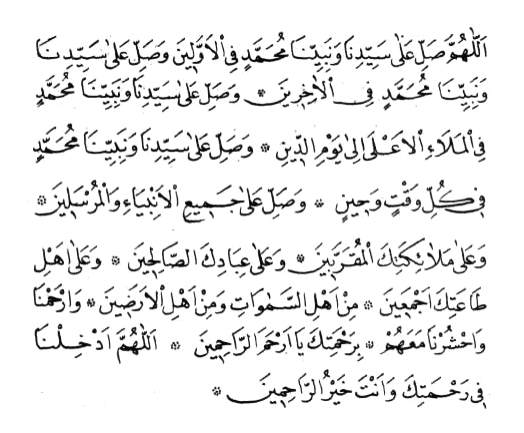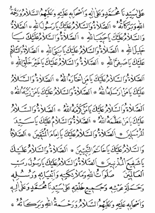 Es-salâtü ves-selâmü aleyke yâ Rasûlallâh.. Es-salâtü ves-selâmü aleyke yâ habiballâh.. Es-salâtü ves-selâmü aleyke yâ halilallâh.. Es-salâtü ves-selâmü aleyke yâ nebiyyallâh.. Es-salâtü ves-selâmü aleyke yâ safiyyallâh.. Es-salâtü ves-selâmü aleyke yâ hayra halgillâh.. Es-salâtü ves-selâmü aleyke yâ menihtârahullah.. .. Es-salâtü ves-selâmü aleyke yâ men erselehullâh.. .. Es-salâtü ves-selâmü aleyke yâ men zeyyenehullâh.. .. Es-salâtü ves-selâmü aleyke yâ men kerramehullâh.. .. Es-salâtü ves-selâmü aleyke yâ men azzemehullâh.. .. Es-salâtü ves-selâmü aleyke yâ seyyid-el-mürseliyn.. .. Es-salâtü ves-selâmü aleyke yâ imam-el-müttegiyn.. .. Es-salâtü ves-selâmü aleyke yâ hâtem-en-nebiyyin.. .. Es-salâtü ves-selâmü aleyke yâ şefi-al-müznibiyn.. .. Es-salâtü ves-selâmü aleyke yâ rasûle Rabbil-âlemiyn.. Salâvatullahi ve melâ’iketihi ve enbiyâ’ihi ve rüsûlihi ve hameleti arşihi ve cemi-i halgihi alâ seyyidinâ Muhammediv ve alâ âlihi ve ashâbihi aleyhi ve aleyhim-üs-selâmü ve rahmetullâhi ve berekâtüh.. Allâhümme salli alâ seyyidinâ ve nebiyyinâ Muhammedin fil-evveliyn.. Ve salli alâ seyyidinâ Muhammedin fil-âhiriyn.. Ve salli alâ seyyidinâ ve nebiyyinâ Muhammedin fil-melâil â’lâ ilâ yevmid-din ve salli alâ seyyidinâ Muhammedin fi külli vagtiv ve hıyn ve salli alâ cemiy-il enbiyâ-i vel-mürseliyn ve alâ melâ’iketik-el-mugarrabiyn ve alâ ibâdik-es-sâlihiyn ve alâ ehl-i tâ’atike ecmaiyne min ehlis-semâvâti ve min ehl-il eradiyn verhamnâ vahşürnâ me’ahüm bi-rahmetike yâ Erham-er-Râhimiyn.. Allâhümme edhilnâ fi rahmetike ve ente hayr-ür-râhimiyn..