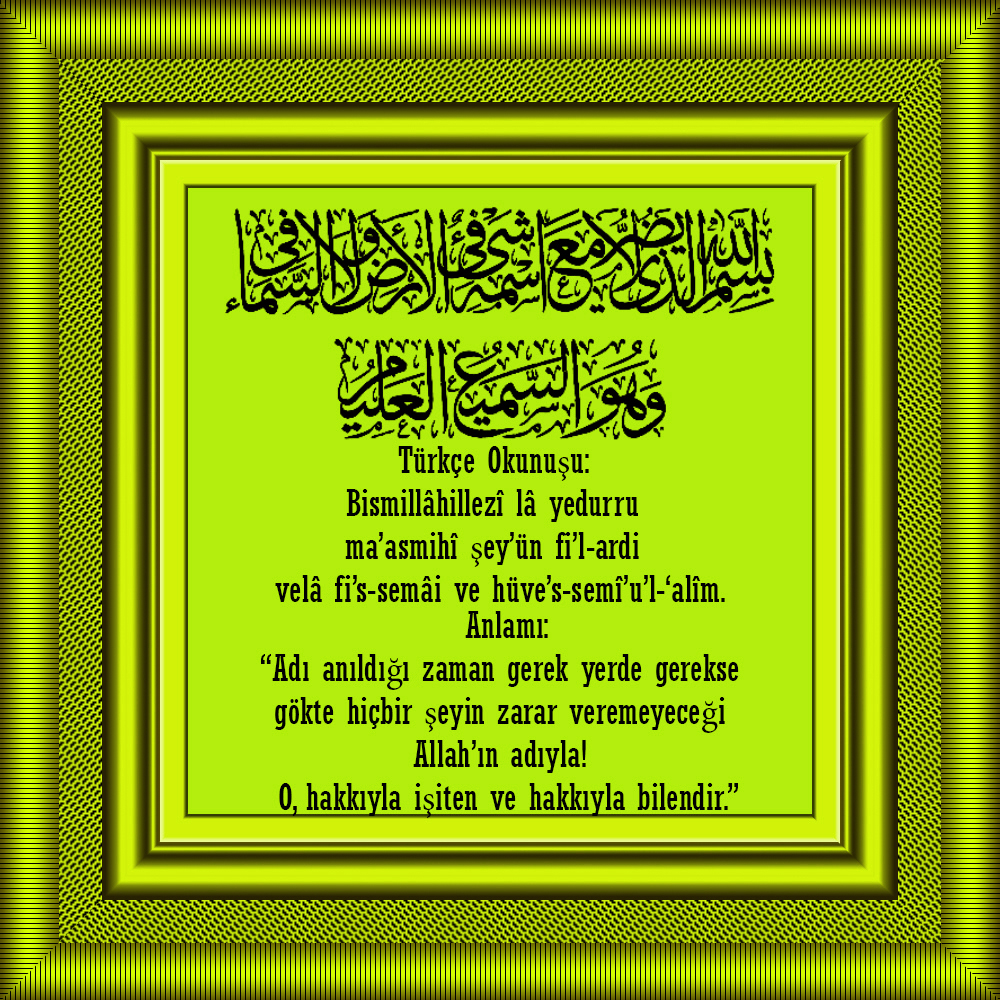 "Bismillâhillezi lâ yedurru ma’asmihi şey’ün fil erdi ve lâ fissemâi ve hüves-semi’ul alim."
